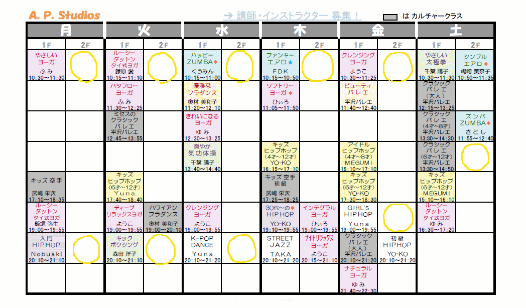 | ☆ ☆ APスタジオの営業案内 → 休館日・代講情報 ☆ ☆ |